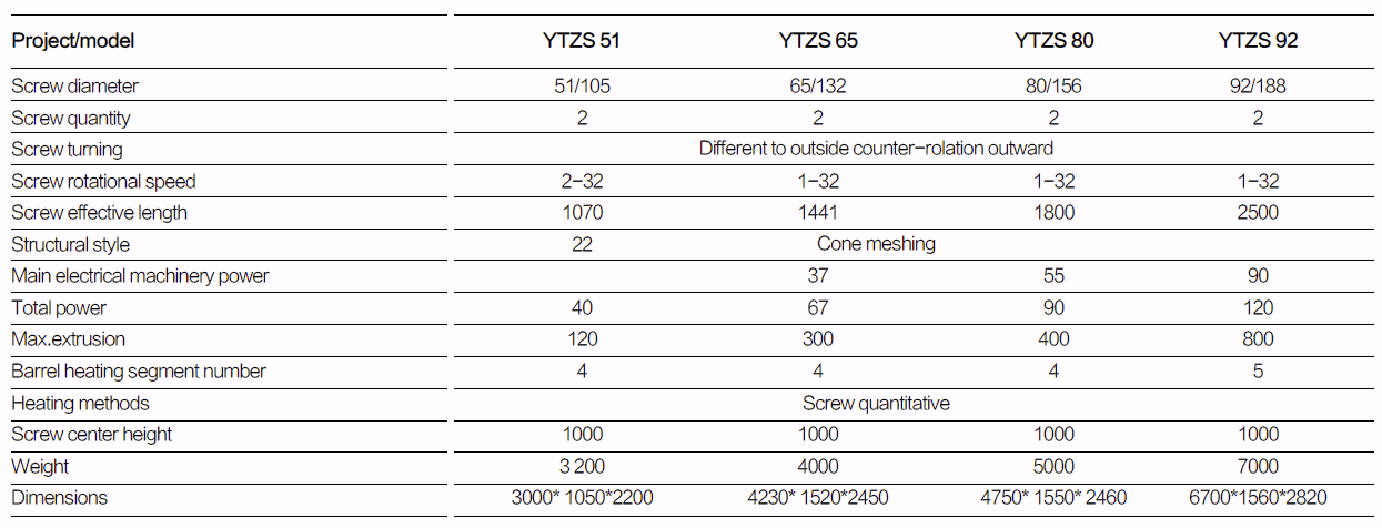 YTZS series conical twin-screw plastic extruder, has forced extrusion,high quality,wide adaptability,long service life, small shear rate ,material is difficult to decompose, good mixing plasticizing performance, direct powd-er molding and so on the characteristics equipped with DC speed regulation, Automatic temperature,vacuum exhaust device. Adapt to the pipe,plate,specialshaped materials production.